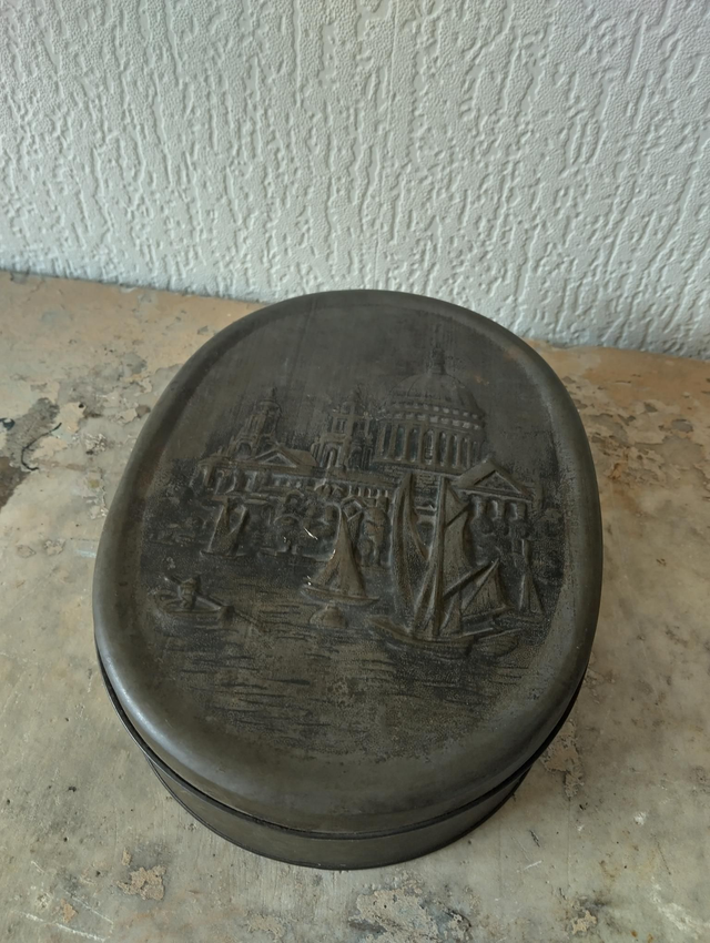 A vintage confectionery tin depicting a Venetian scene on the lid face.
