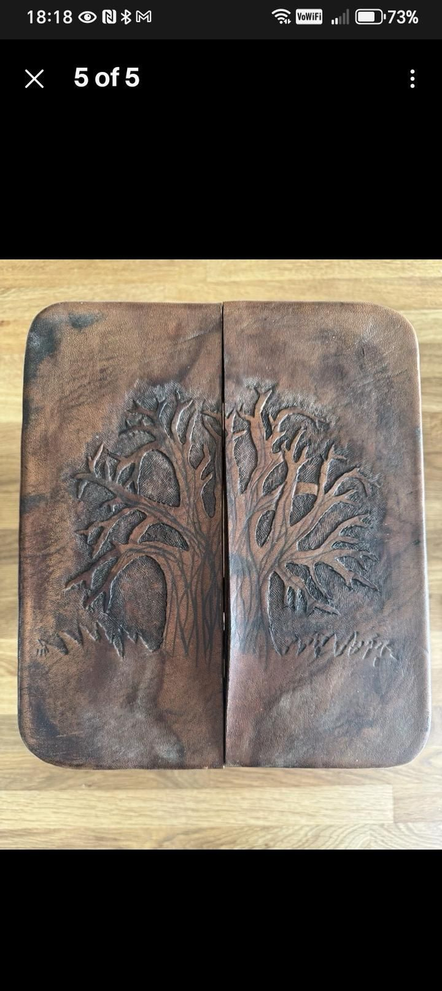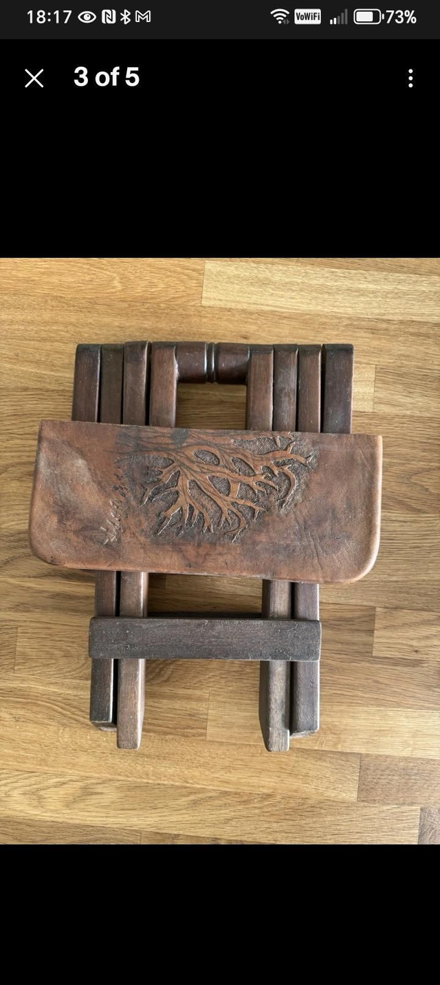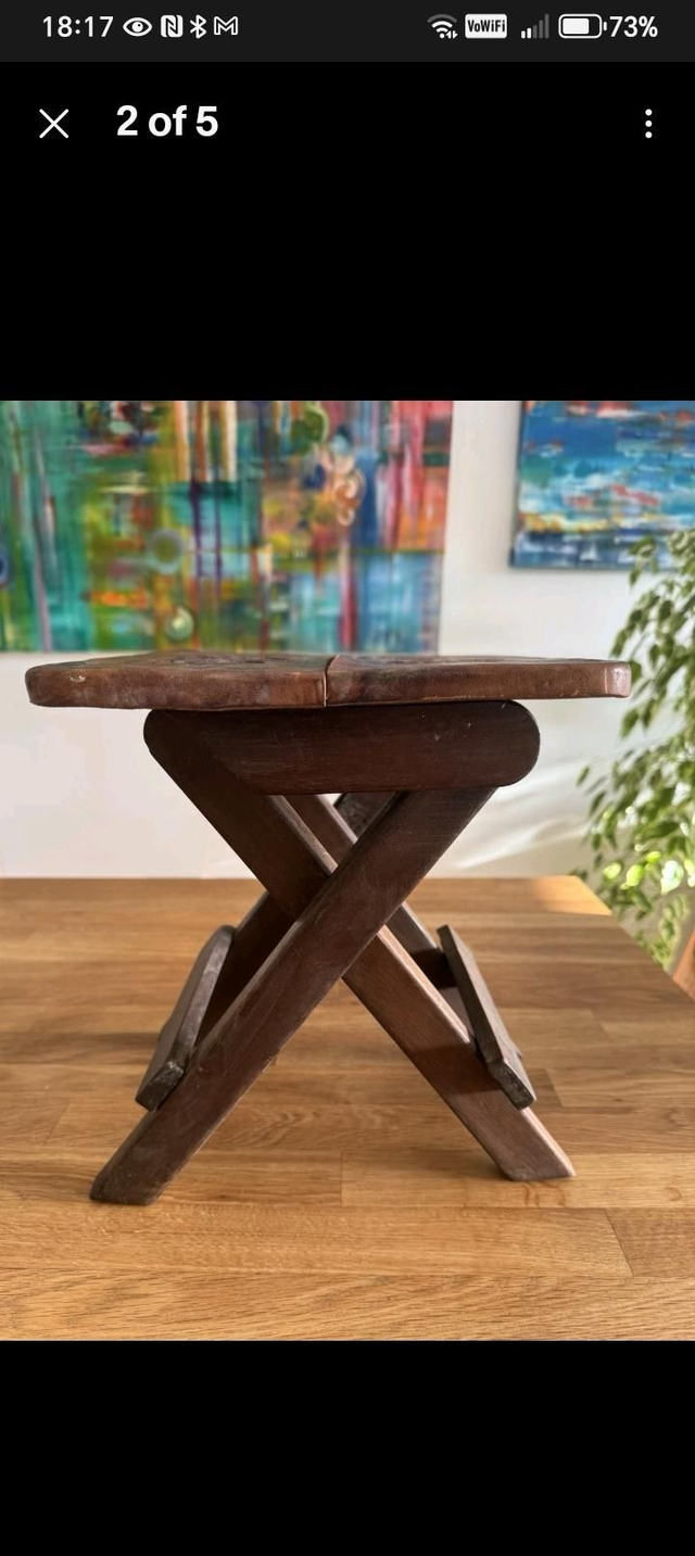 A beautiful vintage embossed leather topped stool offers a quirky, tactile yet functional piece of furniture. The frame is hardwood.